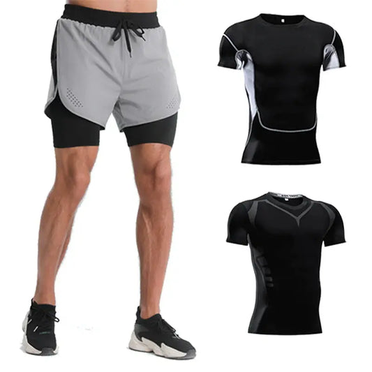Ensemble de Fitness moulant pour hommes, survêtement à manches courtes à séchage rapide, Short de deux pièces, vêtements de gymnastique respirants